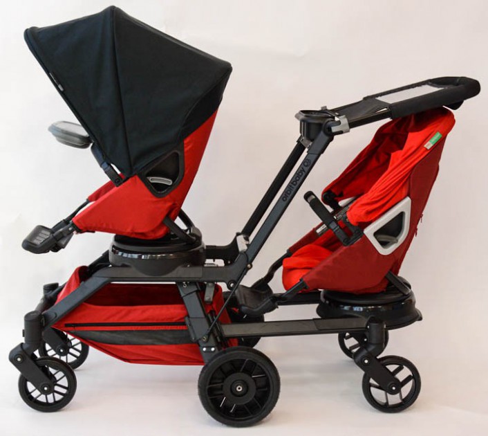 The Orbit Baby G3 with Helix Plus Double Upgrade Kit allows for transportation of two children in a variety of seating options and styles. This combination can accommodate children from newborn to toddler age depending on the kind of seats you purchase and how they are placed. It offers 6 wheel movement, turn in seat seating, recline depending on attachments, and under seat storage. It has cup holder and a tablet holder that doubles as a UV sunshade for toddler seating. It folds/disassembles to make a compact package for easy trunk stowing, and the second seat can be removed easily if only one is desired. This product comes in various colors and seating options depending on preference and needs. It works only with Orbit infant car seats due to unique round base connection system.