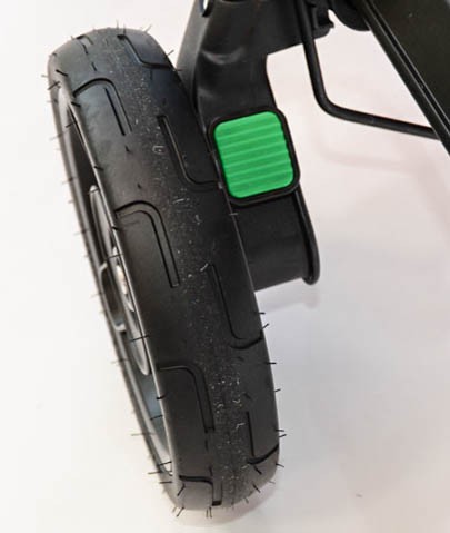 The wheels in the center are plastic and foam-filled rubber. Rubber wheels are usually a smoother ride and are puncture resistant. They are also usually more durable than the plastic wheels and tires of most of the competition. The front and back wheels are foam filled plastic tires on plastic wheels. The center wheels might be of better construction because they bear the burden of most of the weight and pivot of this ride, but it's unfortunate that the front and rear wheels aren't the same. Maneuverability is always better when the tires are made of rubber. The center wheels are also a little loose in the hub.